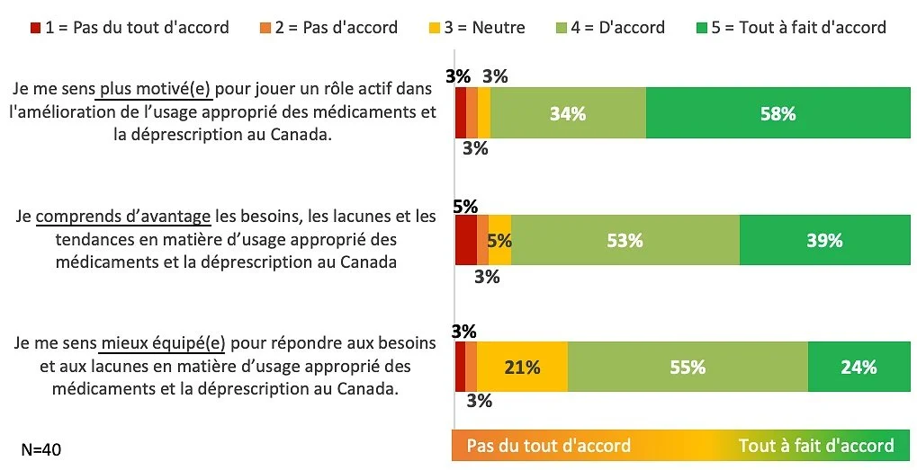 Il était important pour notre équipe de mesurer l’impact de l’événement sur les participants, via l’utilisation d’un court sondage. Quelle satisfaction de constater que, parmi les participants ayant répondu au sondage, la vaste majorité sont repartis en rapportant avoir une meilleure compréhension des besoins, lacunes et tendances en matière d’usage approprié des médicaments et la déprescription au Canada. De façon similaire, la plupart des répondants ont rapporté se sentir plus plus motivés et mieux outillés pour jouer un rôle actif afin d’améliorer l’usage approprié des médicaments et la déprescription (voir figure 1).
