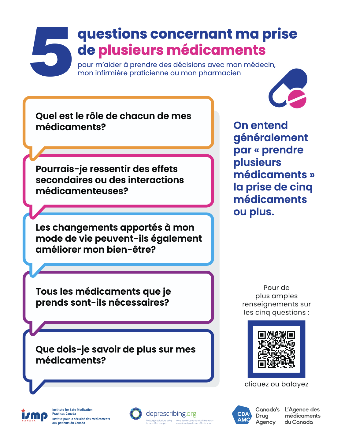 Cette brochure présente cinq questions clés à poser régulièrement à vosprofessionnels de la santé. Ces questions vous aident à rester bien informé et à vous assurer que vos médicaments vous conviennent toujours et ont les effets bénéfiques attendus.
