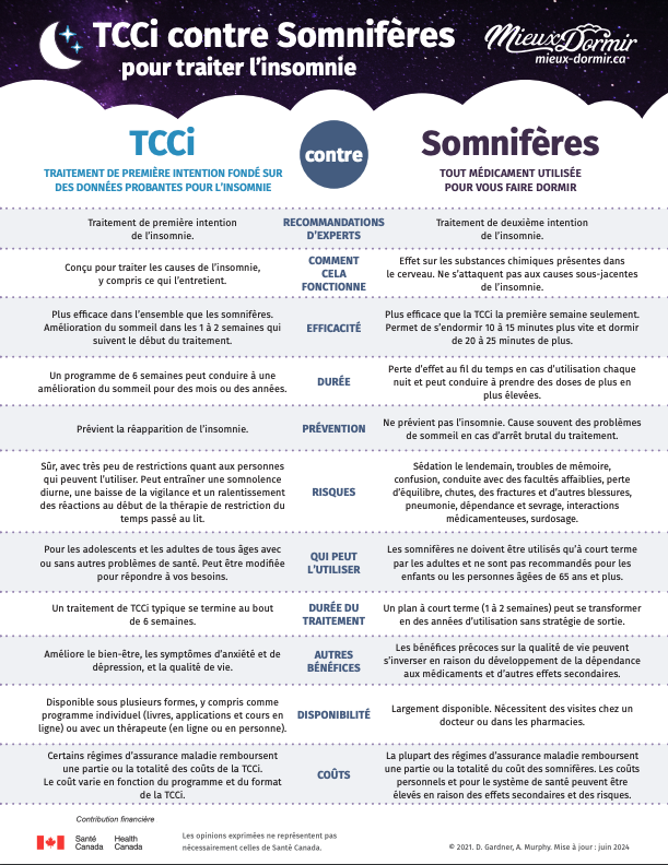 Visitez le site web Mieux-Dormir.ca pour apprendre comment avoir une meilleure nuit de sommeil sans médicament. Mieux Dormir offre une liste de ressources recommandées sur l’hygiène du sommeil et la thérapie du sommeil.